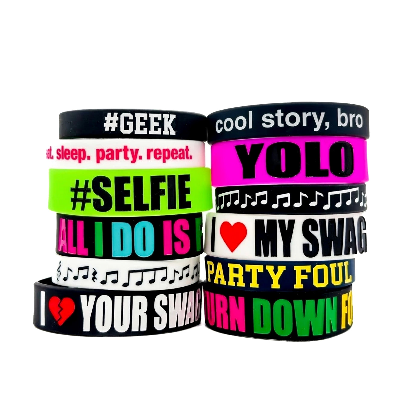 - 1 of each of design pictured, totaling 12 different wristbands