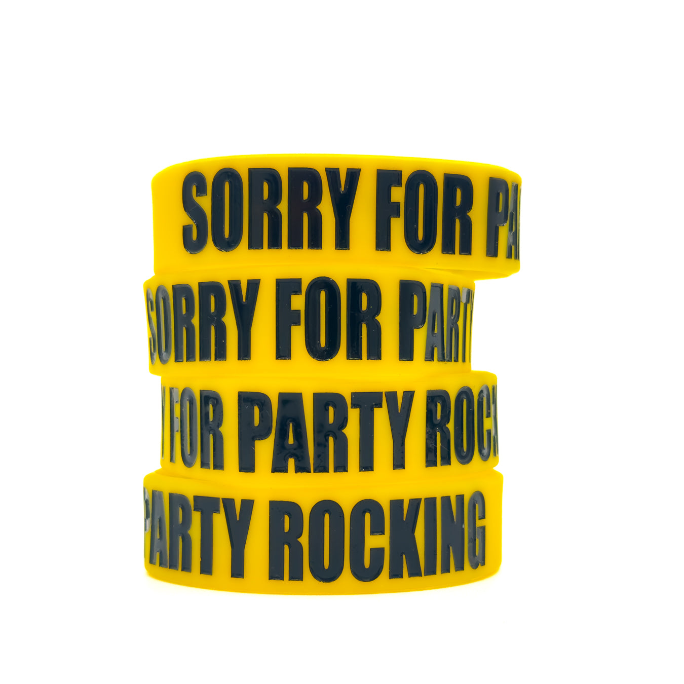 - 1x SORRY FOR PARTY ROCKING: 3/4" height, yellow with black letters